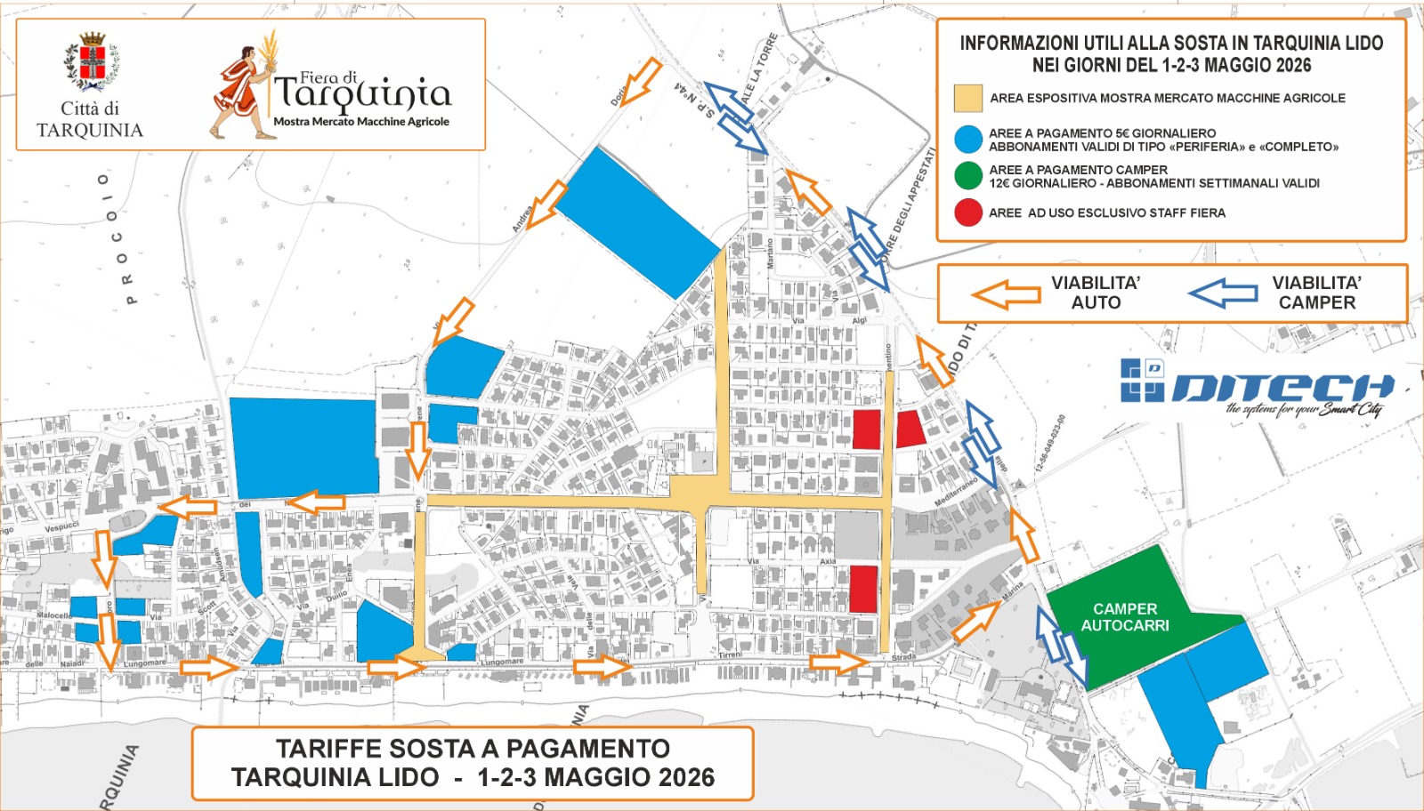 Per i camper la tariffa oraria è euro 3,00, con un minimo di 60 minuti e un massimo giornaliero di euro 12,00.